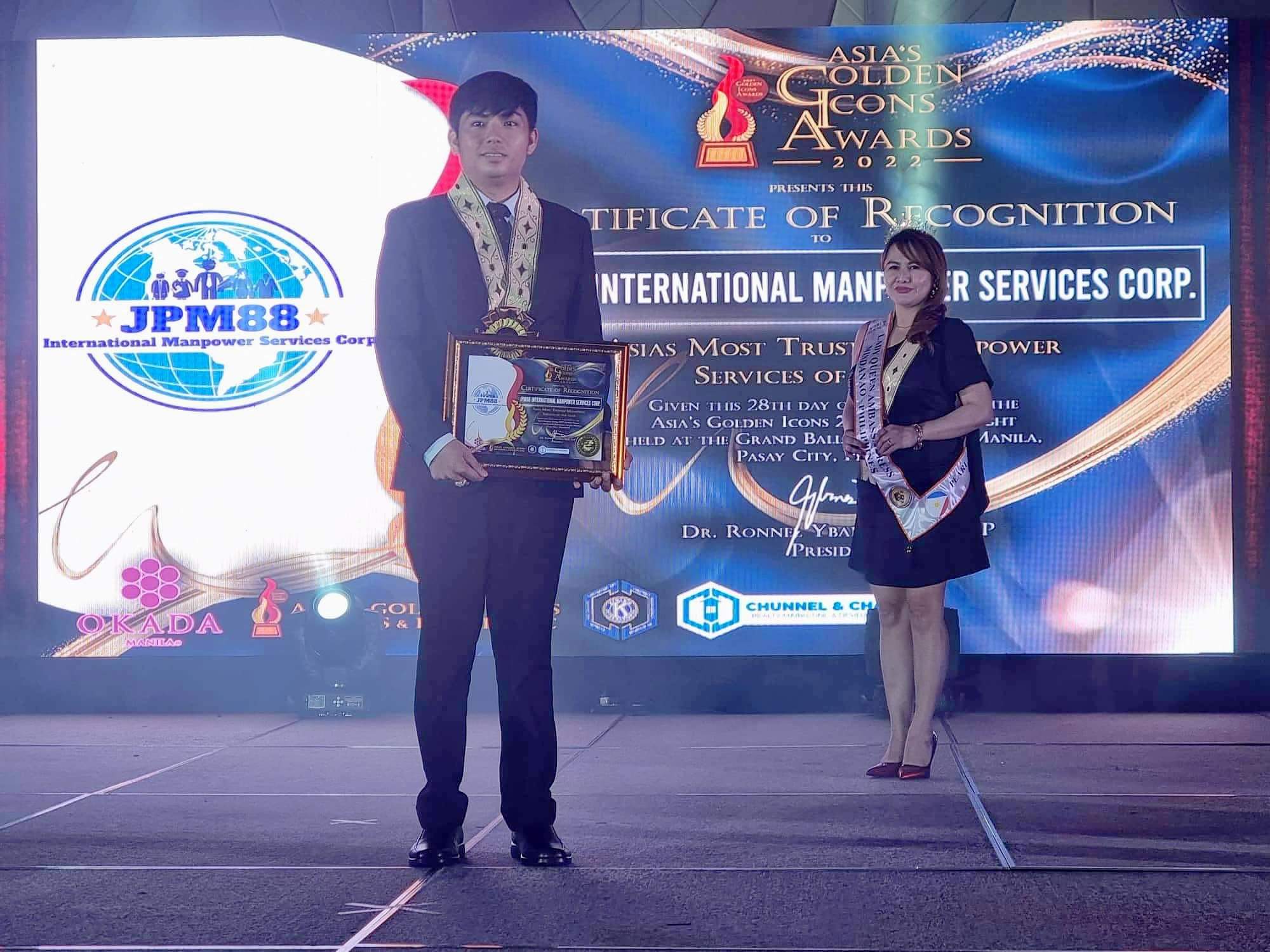 JPM88 International Manpower Services Corp. received an award as ASIA’S MOST TRUSTED MANPOWER SERVICES OF THE YEAR on 28th day of June 2022 from Asia’s Golden Icons Awards.